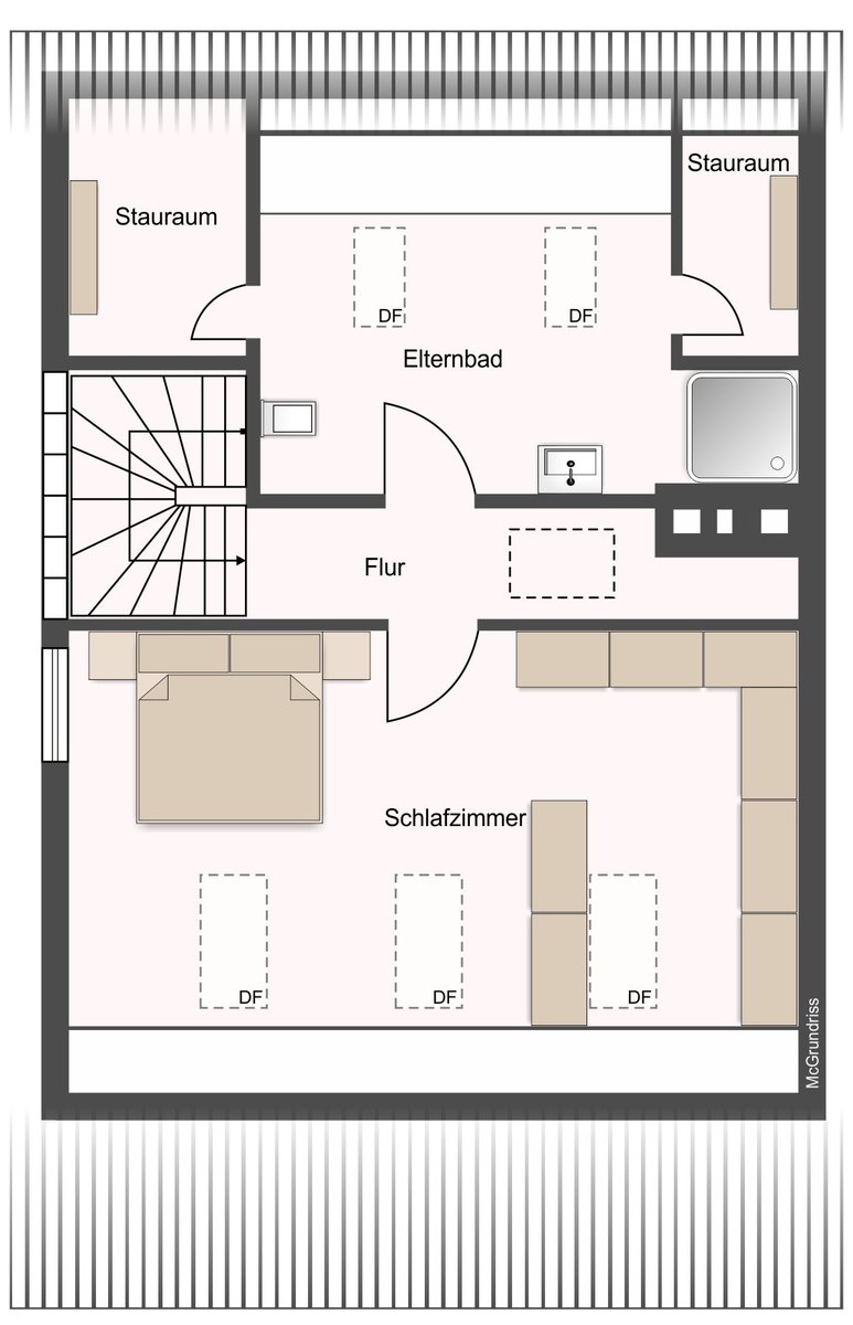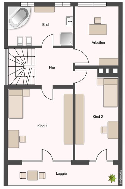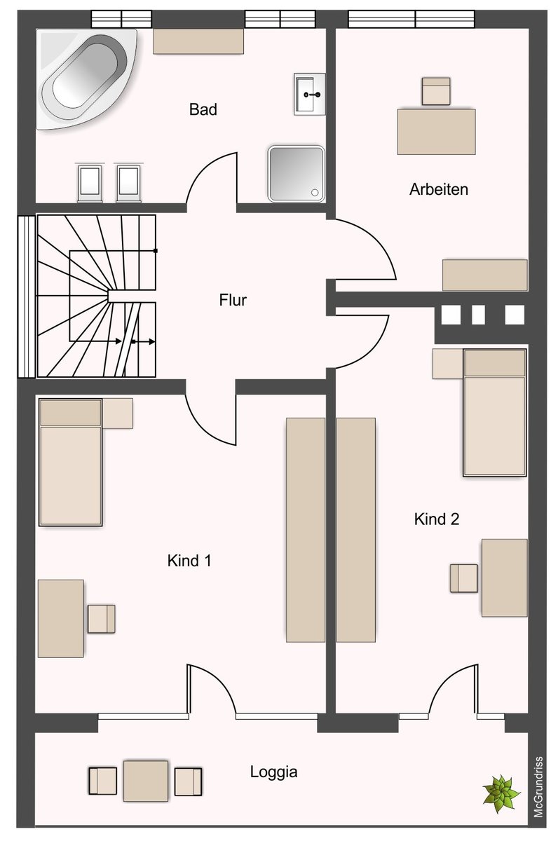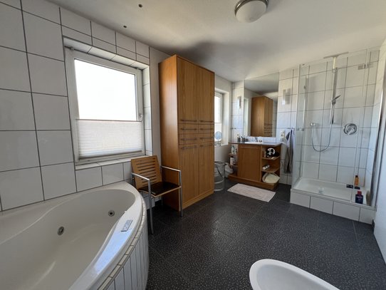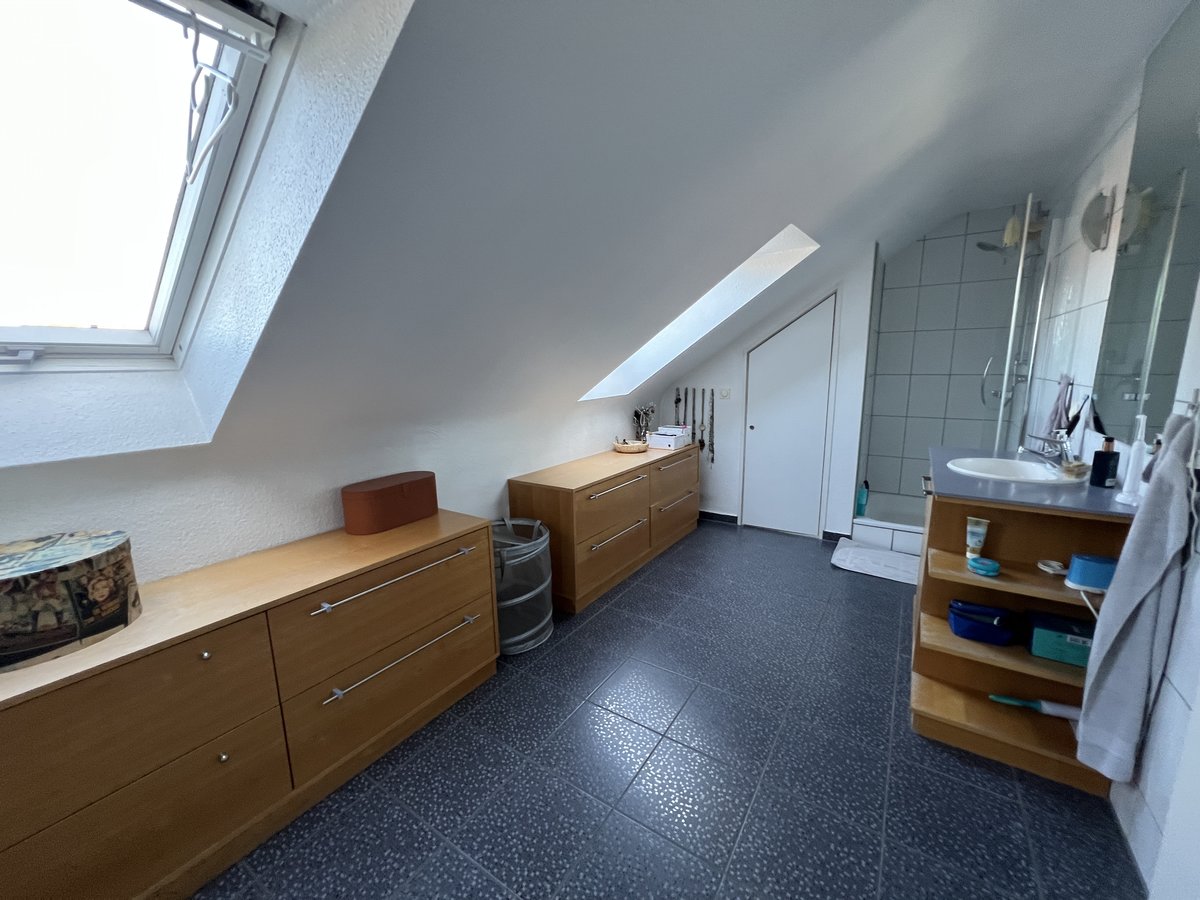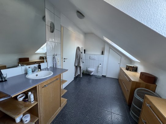 Im Obergeschoss befinden sich drei Zimmer, von denen zwei direkten Zugang zur Loggia haben. Das großzügige Badezimmer ist mit Dusche sowie einer Whirlpool-Badewanne ausgestattet und bietet zusätzlichen Komfort. Im Dachgeschoss befindet sich das Elternschlafzimmer mit Ankleidebereich und großem Bad, das als privater Rückzugsbereich dient.