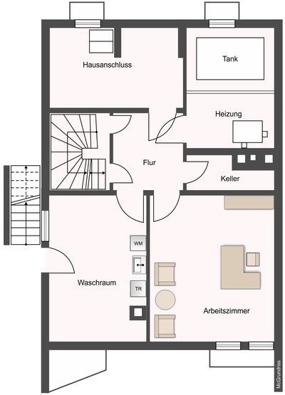 Zusätzlichen Platz bietet ein Arbeitszimmer im Keller.