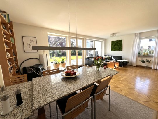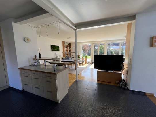 Der offene Wohn- und Essbereich mit Parkettboden und gemütlichem Schwedenofen bildet das Herzstück des Hauses. Die offene Küche mit Einbauküche fügt sich harmonisch in den Wohnbereich ein und schafft eine kommunikative Wohnatmosphäre. Von hier aus besteht direkter Zugang zur großen, teilweise überdachten Terrasse und zum Garten. Fußbodenheizung in vielen Bereichen sorgt für zusätzlichen Wohnkomfort. Im Erdgeschoss befindet sich zudem ein Gäste-WC.